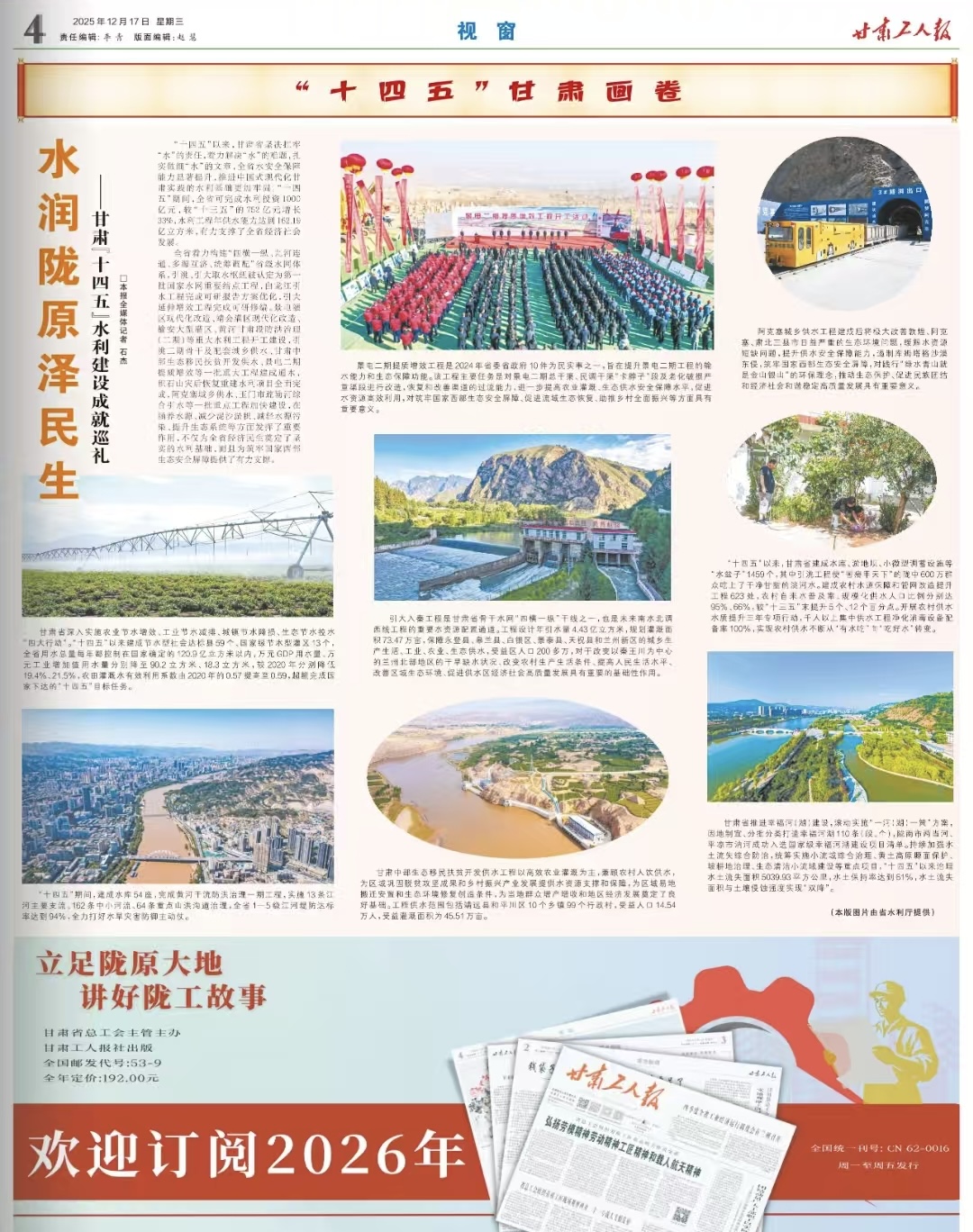 全省着力构建“四横一纵、九河连通、多源互济、统筹调配”省级水网体系,引洮、引大取水枢纽被认定为第一批国家水网重要结点工程,白龙江引水工程完成可研报告方案优化,引大延伸增效工程完成可研修编。景电灌区现代化改造、靖会灌区现代化改造、榆安大型灌区、黄河甘肃段防洪治理(二期)等重大水利工程开工建设,引洮二期骨干及配套城乡供水、甘肃中部生态移民扶贫开发供水、景电二期提质增效等一批重大工程建成通水,积石山灾后恢复重建水利项目全面完成,阿克塞城乡供水、玉门市疏勒河综合引水等一批重点工程加快建设,在涵养水源、减少泥沙淤积、减轻水源污染、提升生态系统等方面发挥了重要作用,不仅为全省经济民生奠定了坚实的水利基础,而且为筑牢国家西部生态安全屏障提供了有力支撑。